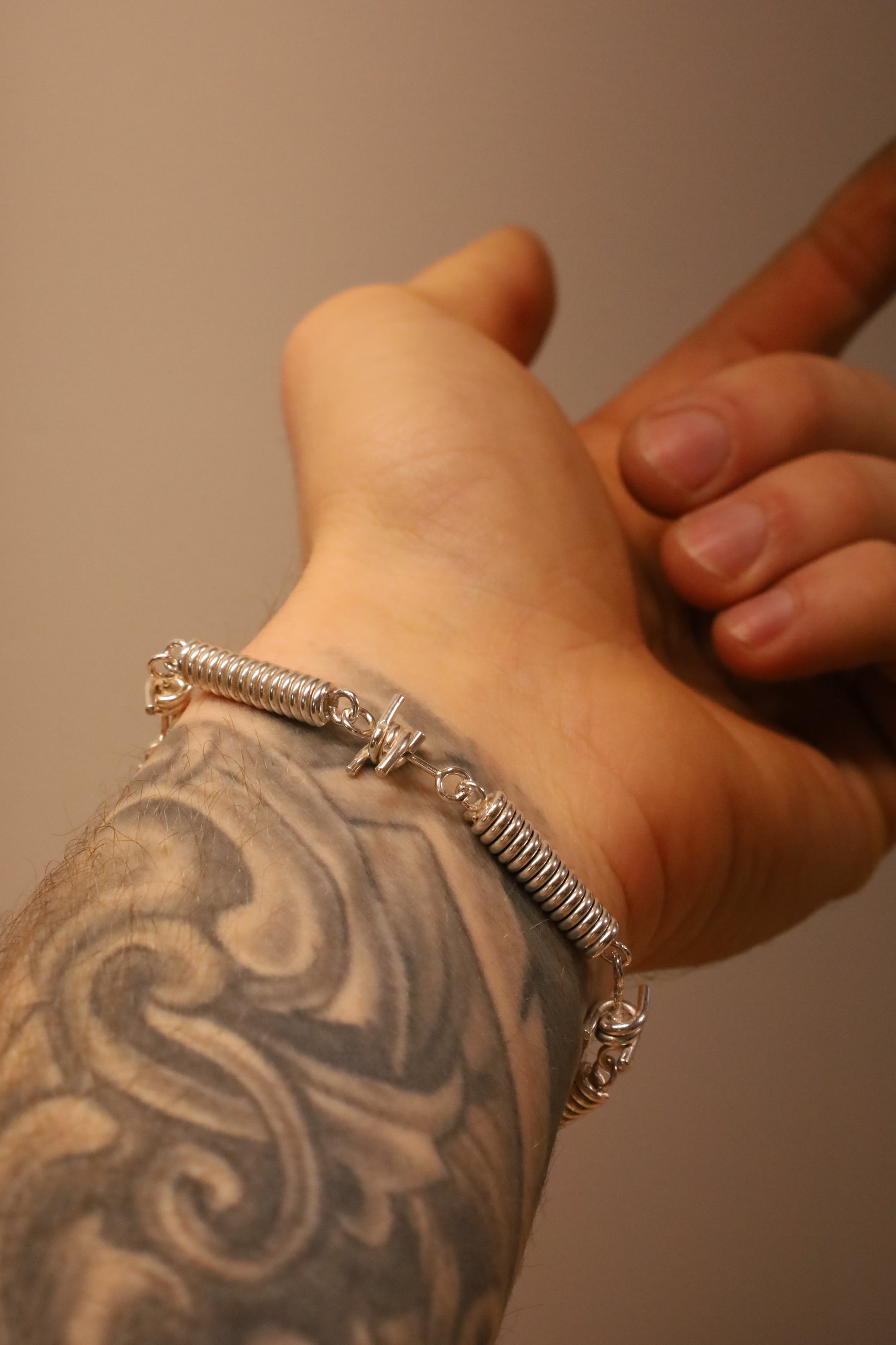 The Barbwire Bracelet is made to feel raw and intentional. Every link is shaped by hand, rigid in form, fluid on the wrist. It’s subtle at first glance, but demands attention and invokes intent.